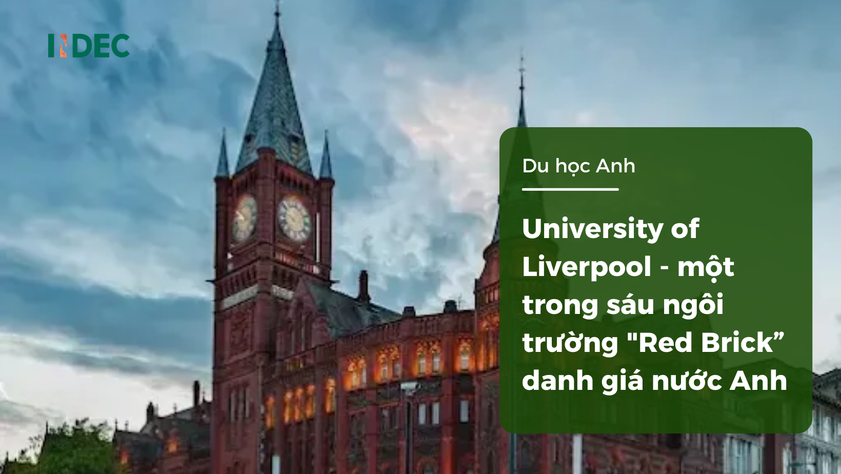 Nằm tại trái tim của thành phố cảng sôi động nhất nước Anh, University of Liverpool không chỉ là một trong sáu ngôi trường “Red Brick” nổi tiếng mà còn là thành viên trụ cột của Russell Group. Với bề dày lịch sử hơn 140 năm cùng 9 học giả đạt giải Nobel, ngôi trường là điểm đến lý tưởng cho những ai tìm kiếm một nền giáo dục đẳng cấp thế giới có giá trị truyền thống lâu đời và tư duy đổi mới. Hãy cùng INDEC ghé thăm ngôi trường này qua bài viết bên dưới.